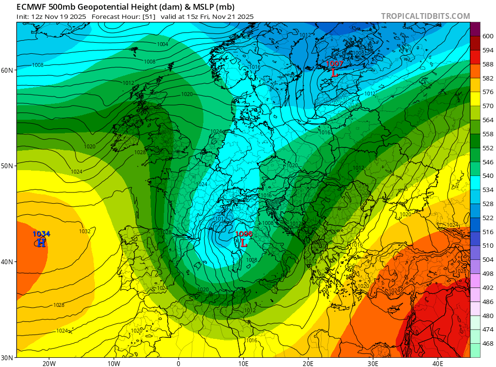 U petak više oblaka iznad Vojvodine, uz mestimičnu slabu do umerenu kišu, akumuliraće se uglavnom između 5 i 10mm vodenog taloga. Konkretnije padavine očekuju se u večernjim časovima. U noći ka suboti, kao i u subotu tokom dana, očekuje se slaba kiša povremeno (bez značajnijih padavina – naročito u prvom delu dana). Uz dalji priliv hladnijeg vazduha u subotu 22. novembra, mestimično se očekuju i susnežica i vlažan sneg (naročito u noći ka suboti i potom ponovo u subotu kasno popodne i uveče). U petak jutarnje temperature od 5 do 8°C, a maksimalne dnevne od 5°C na severu i zapadu do 11°C na jugoistoku Vojvodine. Duvaće uglavnom umeren severozapadni vetar, još tokom jutra i zapadni. Jutarnje temperature u subotu između 1 i 3°C, a maksimalne dnevne od 3 do 5°C – ponovo će biti hladnije na severu i zapadu Vojvodine u odnosu na istok i jug. U subotu će duvati umeren severni i severoistočni vetar.