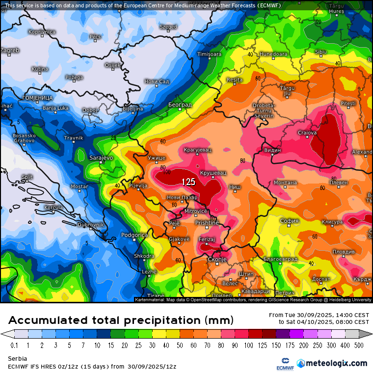 Tako će se tokom četvrtka i petka u većem delu zemlje akumulirati između 40 i 80mm vodenog taloga (više od ukupne prosečne mesečne količine za oktobar će pasti u dva dana). Lokalno se može očekivati i do čak 120mm kiše tokom četvrtka i petka. Najviše padavina očekuje se na jugu i jugoistoku zemlje, te u delu centralnih predela. Osim Vojvodine, znatno manje padavina očekuje se i na zapadu Srbije (Mačvanski i Kolubarski okrug).