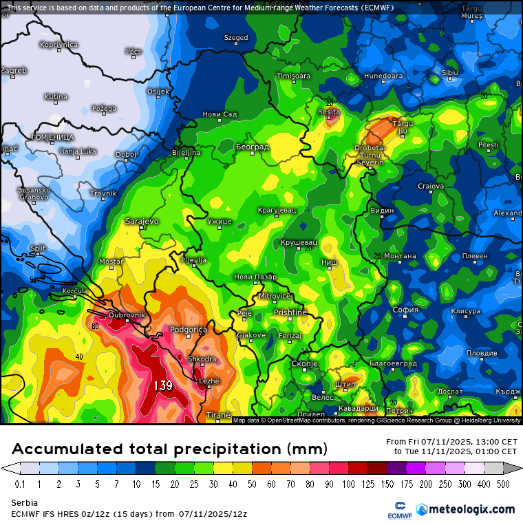 Sredinom i krajem naredne sedmice očekuje se uticaj anticiklona na vreme u našim krajevima, pa će tako biti povećana verovatnoća da u jutarnjim časovima bude magle i niske oblačnosti, a očekuju se i uobičajeno hladna novembarska jutra uz minimume uglavnom između 2 i 4°C, pa će mestimično biti prizemnog mraza. Dnevne temperature biće u laganom porastu u odnosu na ponedeljak, i u najtoplijem delu dana kretaće se uglavnom između 13 i 16°C. Više detalja u novoj srednjoročnoj prognozi koja sledi najkasnije u utorak.