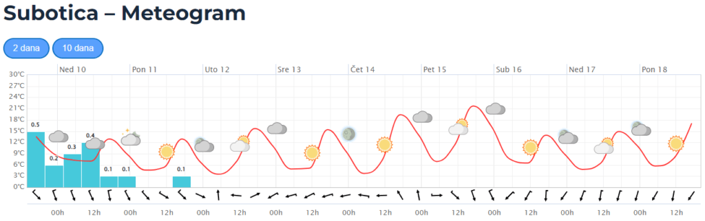 Drugog dana vikenda očekuje se pretežno do potpuno oblačno vreme, još tokom jutra mestimično sa kišom. U nastavku dana biće uglavnom suvo, ali ne treba isključiti kišu u tragovima, naročito pre podne. Uglavnom na jugu pokrajine u nedelju se očekuje još 2-5mm kiše. Duvaće umeren severni i severozapadni vetar. Jutarnje temperature kretaće se između 4 i 5°C, a maksimalne dnevne od 10 do 13°C.