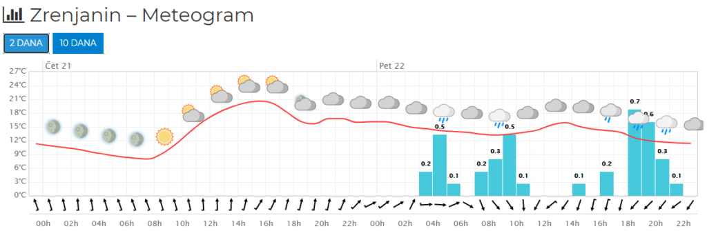 Promena vremena očekuje se u petak oko sredine dana, kada će uz jače naoblačenje uslediti kiša i pad temperatura. Moguća je i pojava lokalnih pljuskova, te je teško reći koliko će i gde kiše pasti, ali u proseku treba očekivati 5 do 15mm vodenog taloga. U petak će se jutarnje temperature kretati između 10 i 12°C, a maksimalne dnevne biće u intervalu od 13°C na severu do 18°C na jugu pokrajine. Najpre će duvati slab do umeren istočni vetar, a potom severni i severoistočni.