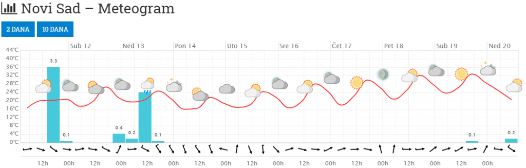 U utorak i sredu takođe treba očekivati zadržavanje suvog vremena, uz više sunčanih, ali i uz povremene intervale sa nešto više oblaka (dnevni razvoj oblačnosti). Dok će se u utorak dnevne temperature kretati između 25 i 27°C, već u sredu u najtoplijem delu dana biće oko 30°C. Od četvrtka 17. juna dnevne temperature će prelati 30°C, dok bi živa u termometru ponegde mogla dostizati i 34°C krajem sledeće nedelje.