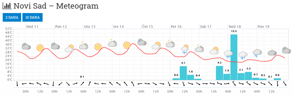 Tokom većine dana naredne sedmice preovladavaće pretežno sunčano vreme. Tek ređa pojava poslepodnevnih pljuskova moguća je u ponedeljak i sredu, ali će se i tada u velikoj većini predela zadržati suvo vreme. Temperature će svakim danom biti sve više, tako da se već od utorka očekuju tropske noći, odnosno minimalne temperature iznad 20°C, dok će se maksimalne dnevne temperature u većini dana kretati između 35 i 38°C, u sredu ponegde i do 39°C. Jedino se u ponedeljak očekuju nešto niže temperature, između 33 i 35°C.