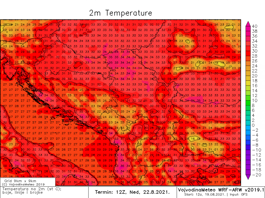 Dok će se u nedelju maksimalne dnevne temperature kretati između 32 i 34°C, u ponedeljak će biti još malo toplije, uz dnevne maksimume između 33 i 36°C. U ponedeljak će duvati uglavnom umeren južni i jugoistočni vetar, krajem dana u okretanju na severozapadni, umeren do jak (premeštanje fronta).