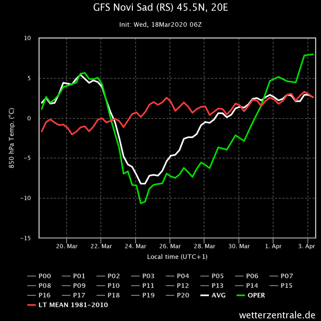 Ensembli GFS modela za treću dekadu marta T1500m – 3 do 4 dana temperature znatno ispod normale