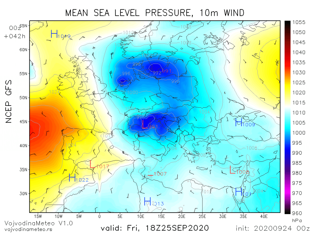Hladni front u sklopu polja niskog vazdušnog pritiska čiji će se centar sutra premeštati iz smera zemalja Beneluksa prema centralnoj Evropi, usloviće sekundarnu ciklogenezu u Đenovskom zalivu, čiji će se centar već sutra tokom dana izmestiti nad severni Jadran. Ovaj ciklon sa pripadajućim hladnim frontom koji stiže do nas u noći između petka i subote diktiraće vremenske prilike u našim krajevima u naredna 2-3 dana.